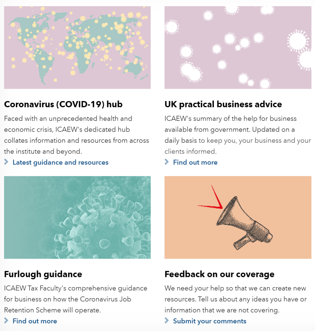 ICAEW官网“疫情专区”上线! 发布时间:2020-04-16 17:48 新冠病毒不仅是一项国际公共卫生紧急事件,也给全球经济发展带来严峻挑战。在这个特殊时期,ICAEW 始终密切关注疫情相关动态,通过ICAEW官网“疫情专区”(icaew.com/coronavirus)为所有会员、ACA学员以及合作伙伴实时分享疫情背景下的行业洞察、应急举措建议及在线活动信息,提供必要的协助与支持,携手共克时艰。